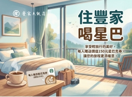 豐家大飯店樓高12層,榮獲澎湖縣政府衛生競賽優良獎,可為您的需求提供全方位旅遊服務。 佇立陽台,一杯咖啡、一盅清茶,遠眺漁港,藍天之下,漁船點點,劃過清澈湛藍的水面,討海人的生活,隨著起伏的波浪與您招手,豐家與您共享澎湖的淳樸和寧靜。